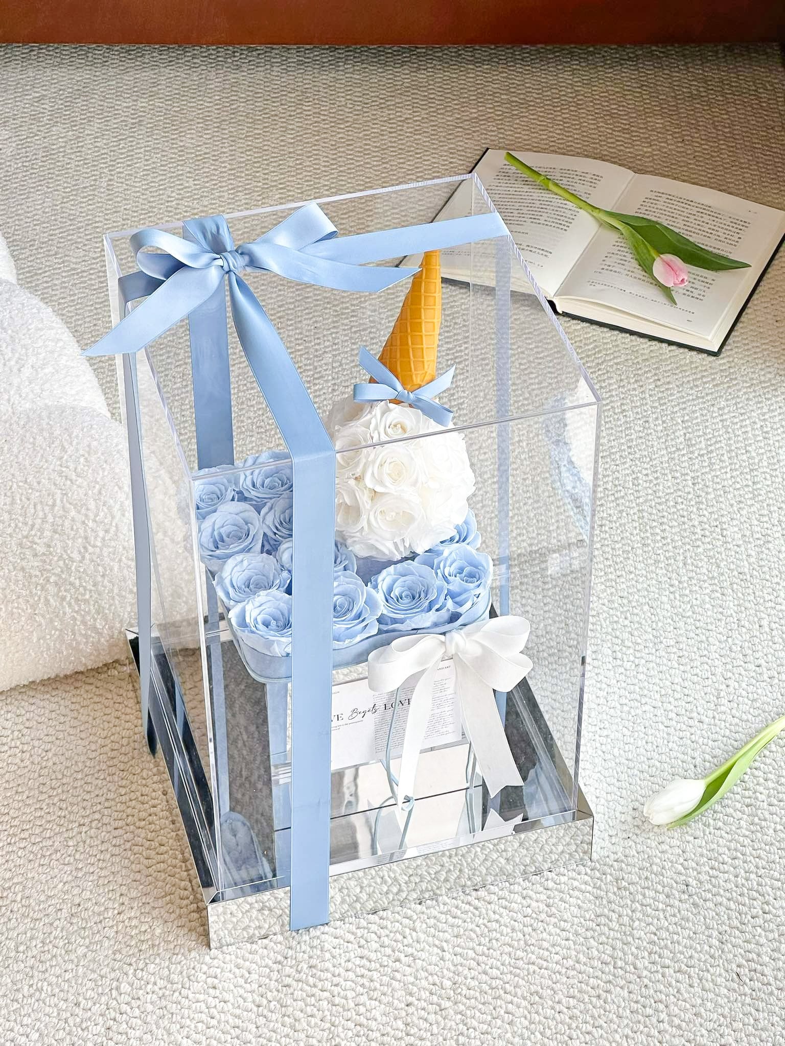 デザインのインスピレーションは、夏の代表的なスイーツであるアイスクリームに基づいています。想像してみてください、暑い夏の午後、公園で手にアイスクリームを持ったお姫様たちが、笑顔を浮かべている姿。そして、その周りには爽やかな花の香りが漂っています。この無邪気な幸福感を永遠に閉じ込めるために、バラの花びらとアイスクリームの形を組み合わせ、見た目にも可愛らしく、童心を感じるブーケを作り上げました。